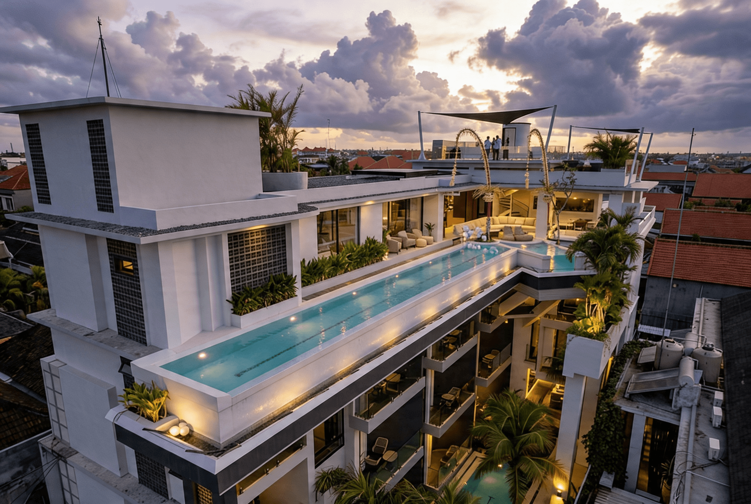 Indulge in the ultimate luxury at The Heli Penthouse, the most exclusive unit within Echo Beach Suites. Located in the heart of Canggu, we offer the perfect escape with total privacy, a 22-meter private pool, and a 12-meter private helipad right on your rooftop.